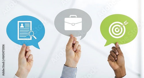 © gusti, Fototapeta premium Hands holding speech bubbles with resume, briefcase, and target icons.