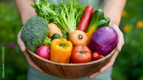 © Dira, Fototapeta premium Hands holding vegetables in wooden bowl. Suitable for healthy food, farming, cooking, nutrition concepts or vegetarian lifestyle content.