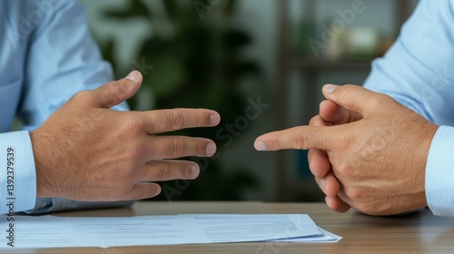Fototapeta premium Hands in Discussion Over Paperwork with Plants in Background