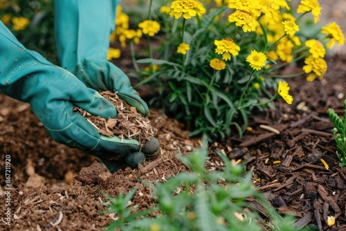 © Horsi, Fototapeta premium Hands in Green Gloves Mulching a Flower Bed