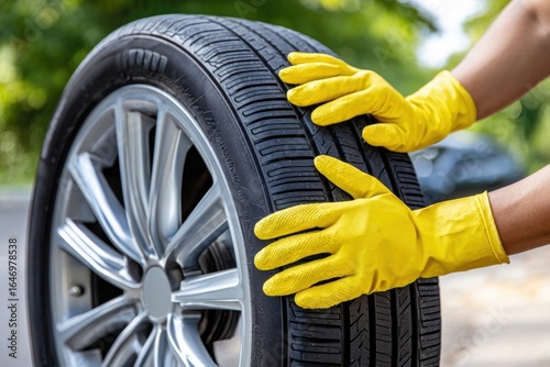 © Netsai, Fototapeta premium Hands in yellow gloves holding a tire, mounted on a silver rim, outside on a blurred background.