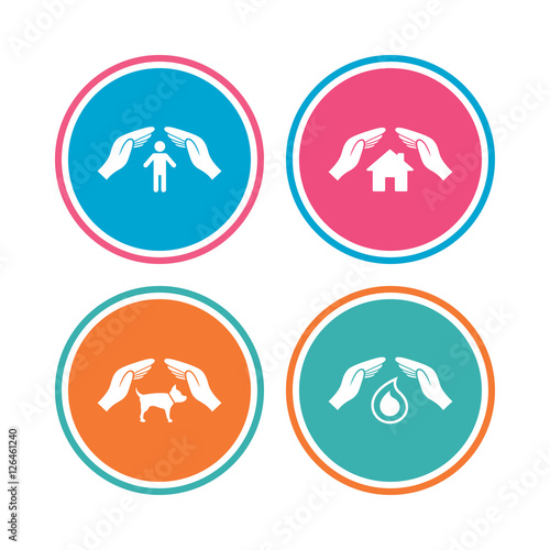 Fototapeta premium Hands insurance icons. Shelter for pets dogs symbol. Save water drop symbol. House property insurance sign. Colored circle buttons. Vector