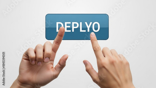 © AH Studio, Fototapeta premium Hands interacting with deploy button for software deployment