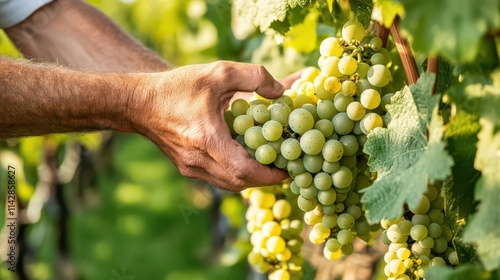 Obraz premium hands of a farmer gently picking grapes, vivid green vineyard backdrop,...