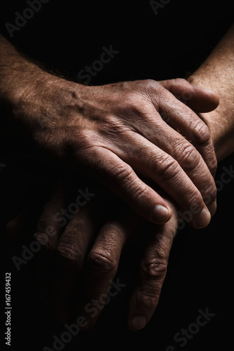 Fototapeta premium Hands of an elderly man's palms together, thought about problems, with dramatic lighting