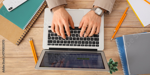 Obraz premium Hands of businessman using laptop at wooden table, top view