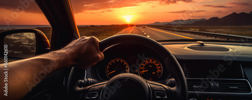 © thejokercze, Obraz premium Hands of car driver on steering wheel