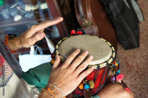 Fototapeta premium Hands of man playing African drum or djembe. Chiang Mai, Thailand.