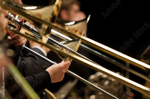 © furtseff, Obraz premium Hands of man playing the trombone in the orchestra