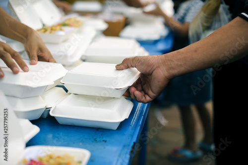 © kuarmungadd, Fototapeta premium hands of the poor receive food from the donor's share. poverty concept
