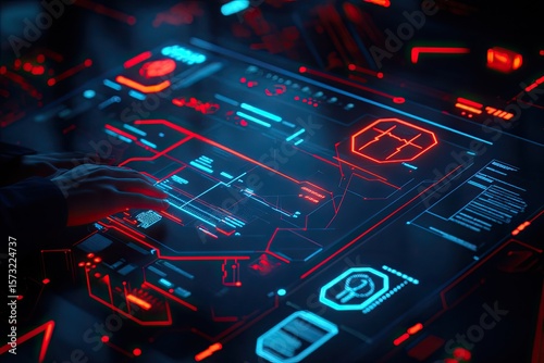 © oldcreativestd, Obraz premium Hands on glowing futuristic interface