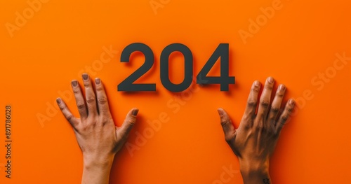 © Mandeep, Obraz premium Hands on Orange Wall with Number 204