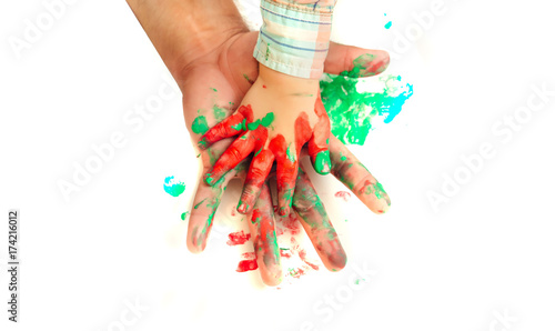 © Volodymyr, Fototapeta premium Hands painted in colorful paints on white background