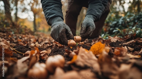 © JH45, Obraz premium Hands Picking Up Autumn Leaves and Acorns in a Forested Landscape