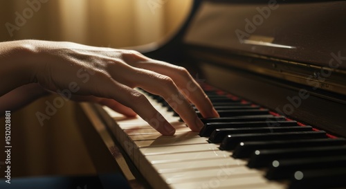 © Pawon.STD, Obraz premium Hands playing a piano keyboard in a dimly lit room with curtains.