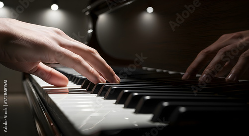 Fototapeta premium Hands playing grand piano with dramatic lighting, close up