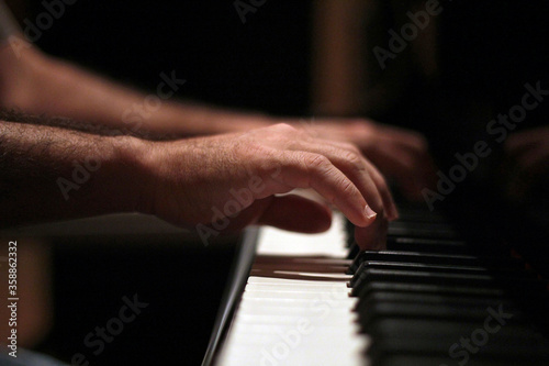 © Stela, Fototapeta premium Hands playing piano in close up