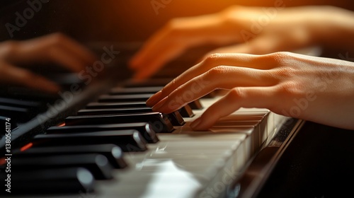 © lona, Fototapeta premium Hands playing piano keys, concert hall, spotlight