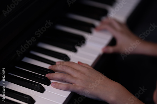 © Tatjana, Fototapeta premium Hands playing piano, music education and learning concept.