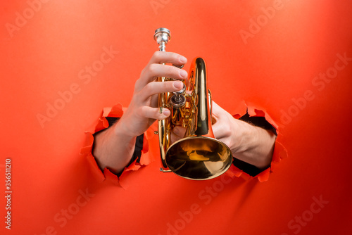 © yuriygolub, Obraz premium Hands playing pocket trumpet torn holes in red paper background