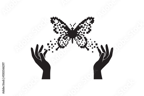 Obraz premium Hands Releasing Pixel Butterfly Silhouette