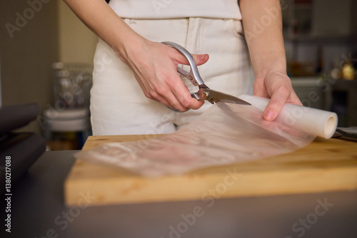 © Евгений Вершинин, Obraz premium Hands Skillfully Preparing Vacuum Sealing for Food Preservation and Storage Purposes