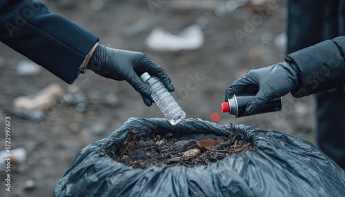 Obraz premium Hands sorting trash into a black bin