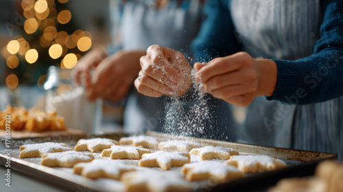 © perfectlab, Obraz premium Hands sprinkling powdered sugar on freshly baked star-shaped cookies on a baking tray with festive holiday lights in the background