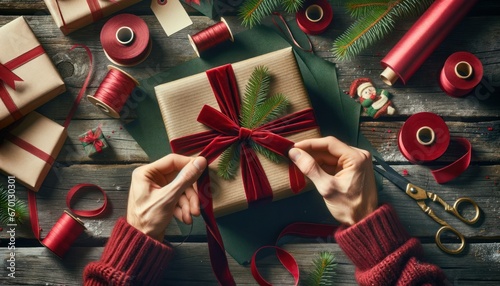 © Cad3D.Expert, Fototapeta premium Hands tying a velvet red ribbon on a Christmas gift wrapped in green paper on a rustic wooden table.