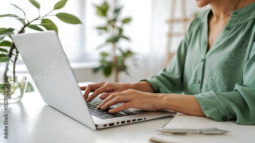 © Foto Fusion, Fototapeta premium Hands, typing and woman in home office with laptop, research or networking for freelance project. Remote work, connectivity and girl at desk writing email, report or online review for business plan