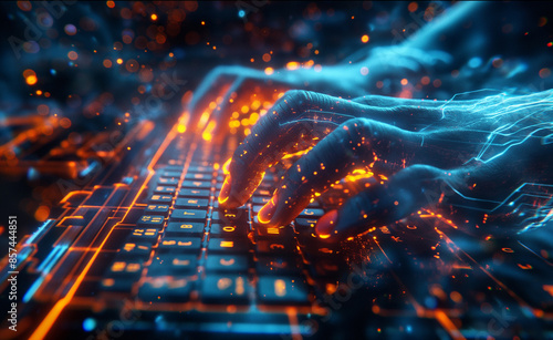 Obraz premium Hands typing on a glowing keyboard with digital effects.