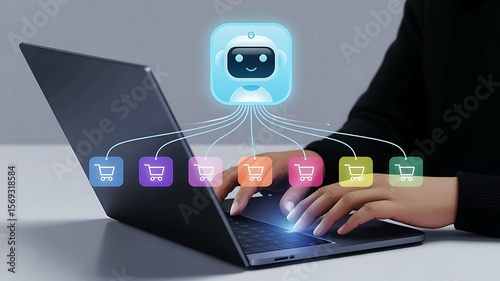 Fototapeta premium Hands typing on a laptop with a chatbot icon connecting to shopping cart icons, representing online shopping and AI assistance.