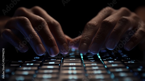 Fototapeta premium Hands Typing on Illuminated Keyboard in Dark Environment, Technology