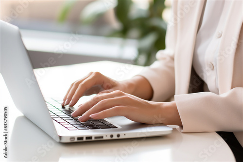 © Elena, Naklejka premium hands typing on laptop keyboard at table, close up view