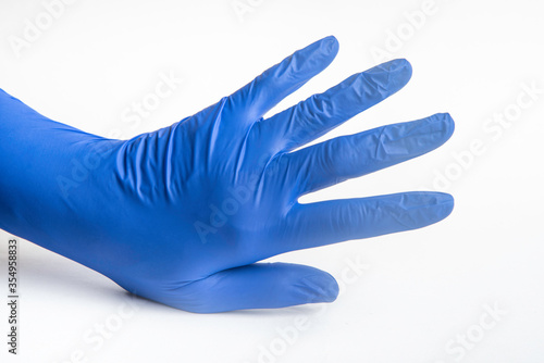 Fototapeta premium Hands wearing blue latex disposable gloves set on plain white background.