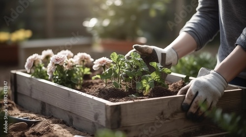 Fototapeta premium Handschuhe Hände pflanzen im Hochbeet