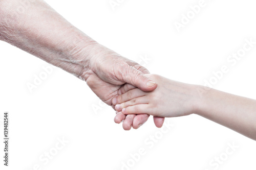 © Gribanov, Fototapeta premium Handshake between grandmother hand and arm granddaughter isolated on white background