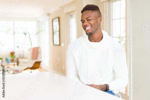 Fototapeta premium Handsome african american man on white table looking away to side with smile...