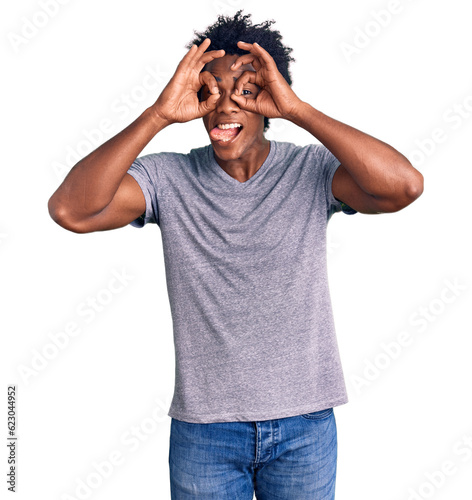 Fototapeta premium Handsome african american man with afro hair wearing casual clothes doing ok gesture like binoculars sticking tongue out, eyes looking through fingers. crazy expression.