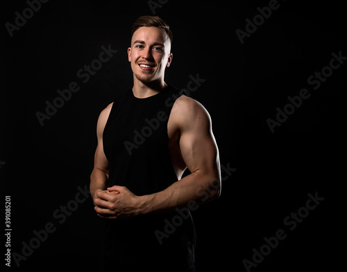 © Anetta, Fototapeta premium Handsome and fit bodybuilder posing on black background in workout gear