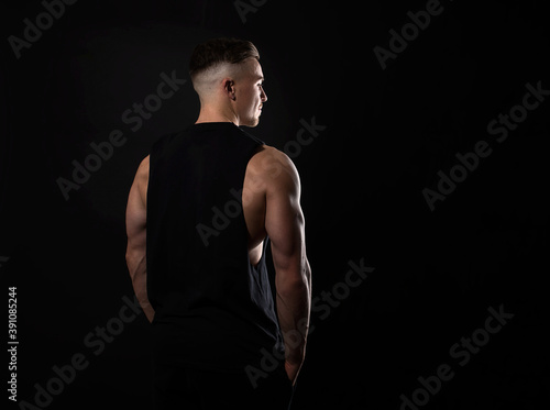 © Anetta, Fototapeta premium Handsome and fit bodybuilder posing on black background in workout gear