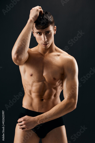 Fototapeta premium handsome athletic man in dark shorts posing dark background