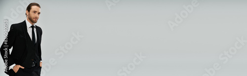 Fototapeta premium Handsome, bearded businessman in suit and tie stands confidently with hands in pockets on a grey studio background.