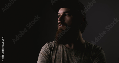 © Vulp, Fototapeta premium Handsome bearded man in tshirt and hat with crossed arms looking away on darkling background