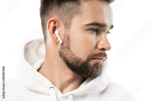 © blackday, Obraz premium Handsome bearded man in white clothes using wireless earbuds on white background