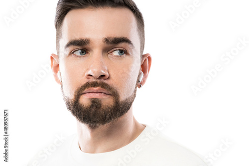 © blackday, Obraz premium Handsome bearded man in white clothes using wireless earbuds on white background