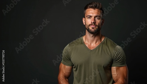 © Vadym, Naklejka premium Handsome bearded man with muscular build poses against dark backdrop in t-shirt. Confident guy with defined biceps, triceps, chest. Healthy sporty model with copy space for advertising.