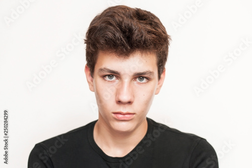 © Мар'ян Філь, Obraz premium Handsome boy of adolescence with a sad, concentrated face on a light background