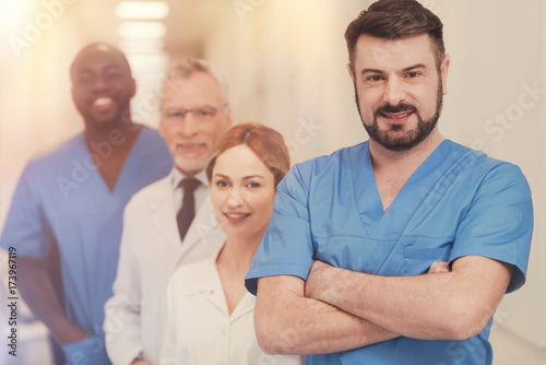 © zinkevych, Fototapeta premium Handsome brunette crossing arms on chest