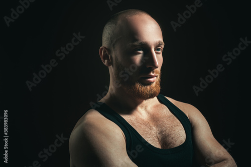 © Volodymyr, Fototapeta premium Handsome business man on black. Serious concentrated male model.